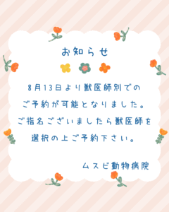 お知らせ 指名予約始まりました! 2025.08.25 Tweet Share Hatena Pocket RSS feedly Pin it この記事のタイトルとURLをコピーする 8/13より今までもご利用いただいている予約アプリ『ペットPASS』にて獣医師別でのご予約が可能となりました! ご指名ございましたら獣医師を選択の上ご予約下さい。 ご不明な点がございましたらお問い合わせください。 Tweet Share Hatena Pocket RSS feedly Pin it この記事のタイトルとURLをコピーする 症例集:うさぎの不正咬合を更新しました。 前の記事 うさぎのお手入れ2 次の記事